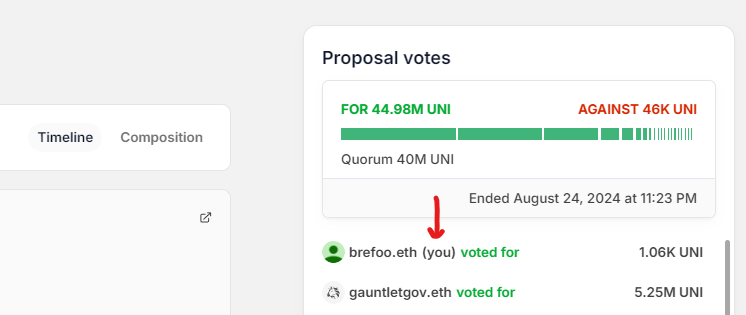 An important note: much like voter registration in a larger democracy, for UNI to be used in a vote it must be delegated before both the voting period. This means if you want your vote to count, you must delegate it in anticipation of any proposal you may be interested in.